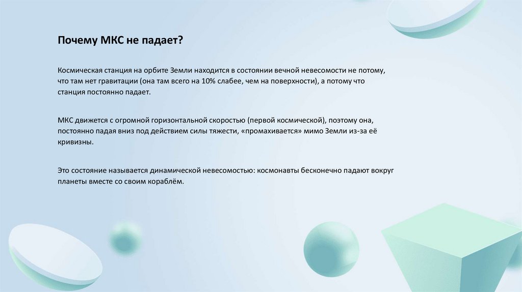 Почему МКС не падает?Космическая станция на орбите Земли находится в состоянии вечной невесомости не потому,