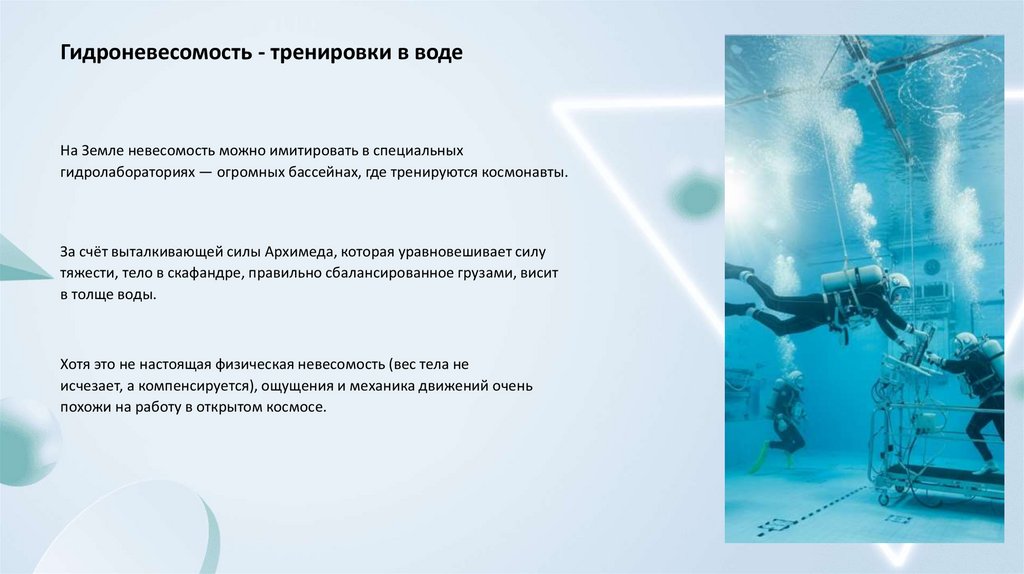 гидролабораториях — огромных бассейнах, где тренируются космонавты.