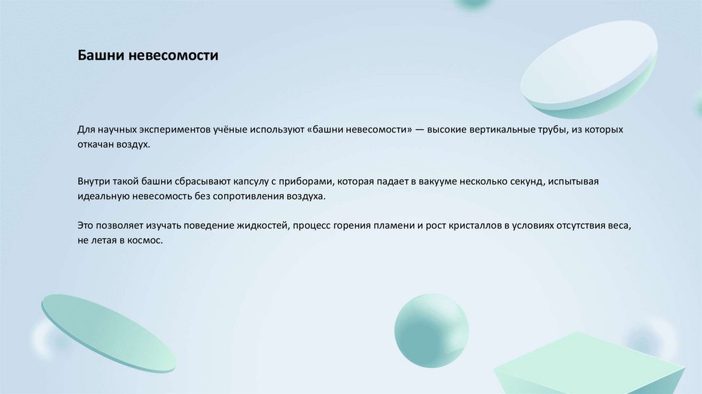 Башни невесомостиДля научных экспериментов учёные используют «башни невесомости» — высокие вертикальные трубы, из которых