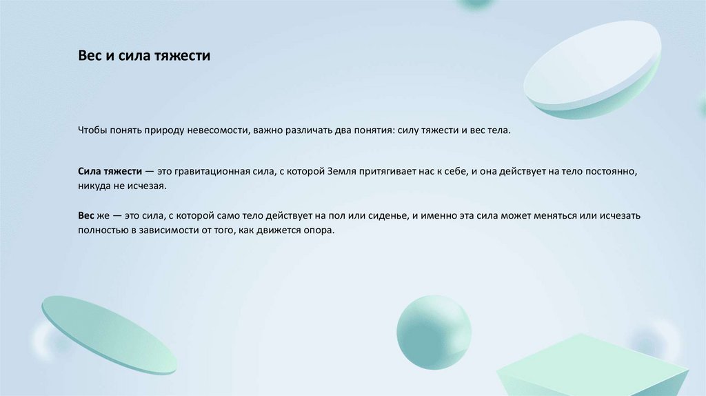 Вес и сила тяжестиЧтобы понять природу невесомости, важно различать два понятия: силу тяжести и вес тела.