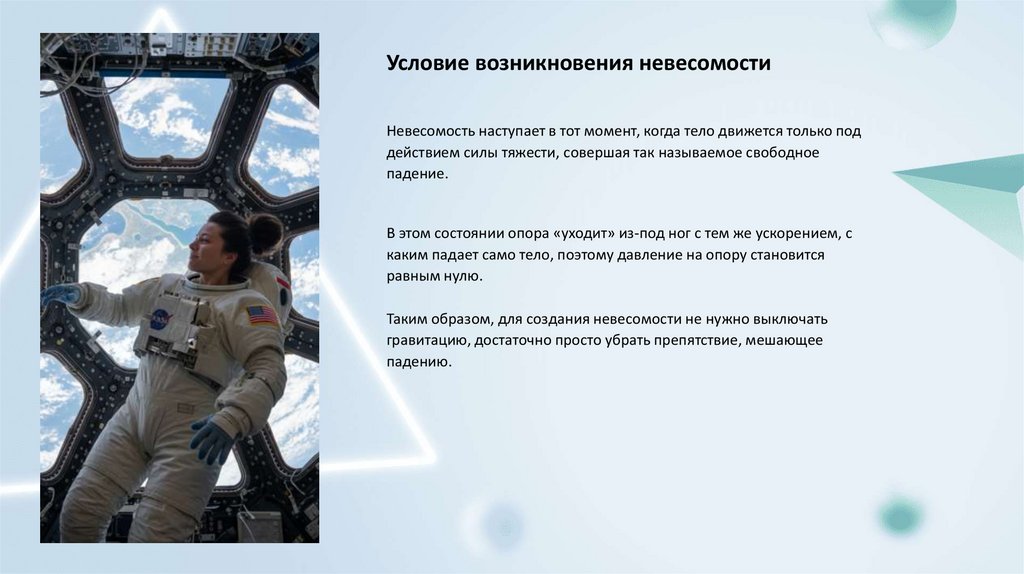 Условие возникновения невесомостиНевесомость наступает в тот момент, когда тело движется только под