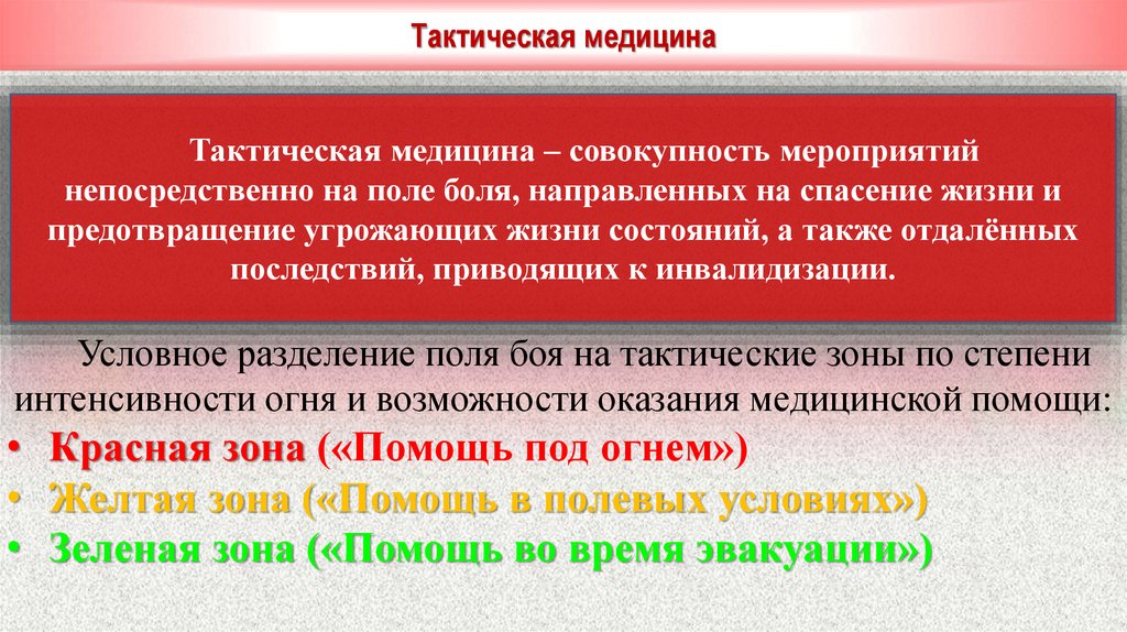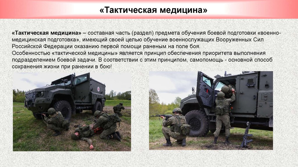 «Тактическая медицина»«Тактическая медицина» – составная часть (раздел) предмета обучения боевой подготовки «военномедицинская подготовка», имеющий своей целью обучение военнослужащих Вооруженных Сил
