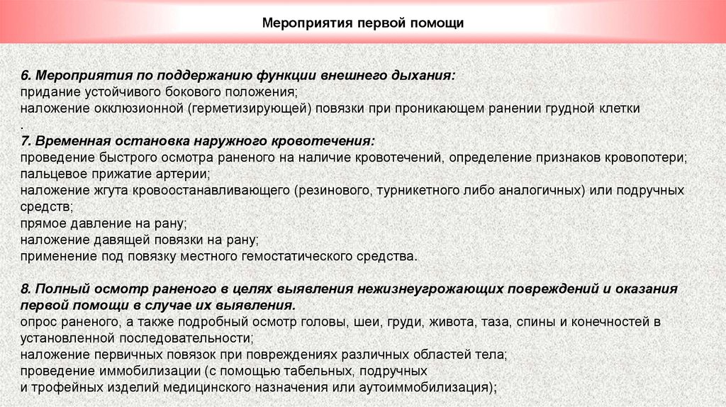Мероприятия первой помощи2. Первичный осмотр раненого на предмет выявления жизнеугрожающих состояний.