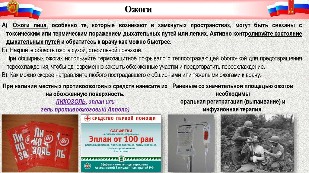 При наличии местных противоожоговых средств нанесите их Раненым со значительной площадью ожогов