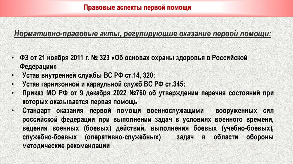 Правовые аспекты первой помощиНормативно-правовые акты, регулирующие оказание первой помощи: