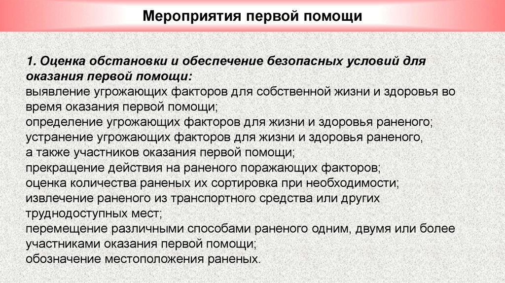 Мероприятия первой помощи1. Оценка обстановки и обеспечение безопасных условий для