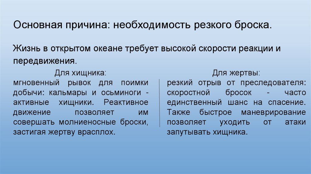 Основная причина: необходимость резкого броска.Жизнь в открытом океане требует высокой скорости реакции и