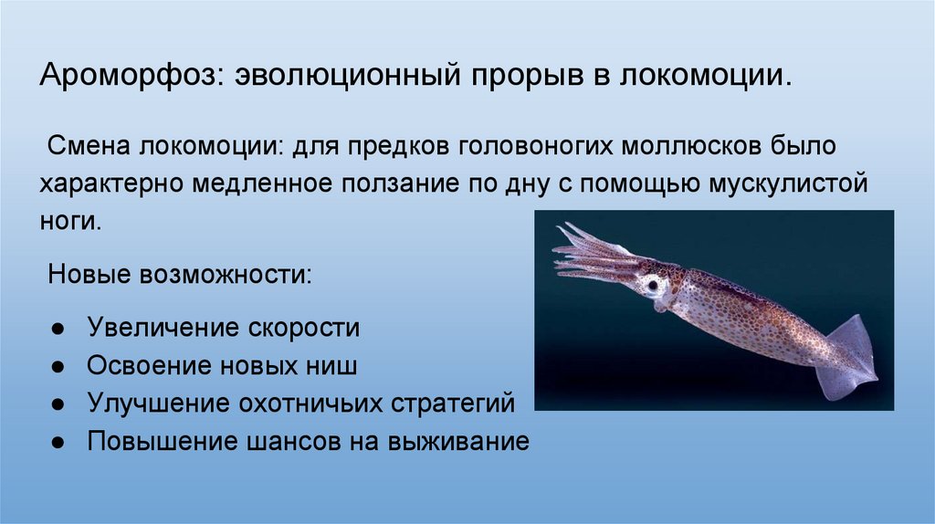 Ароморфоз: эволюционный прорыв в локомоции.Смена локомоции: для предков головоногих моллюсков было