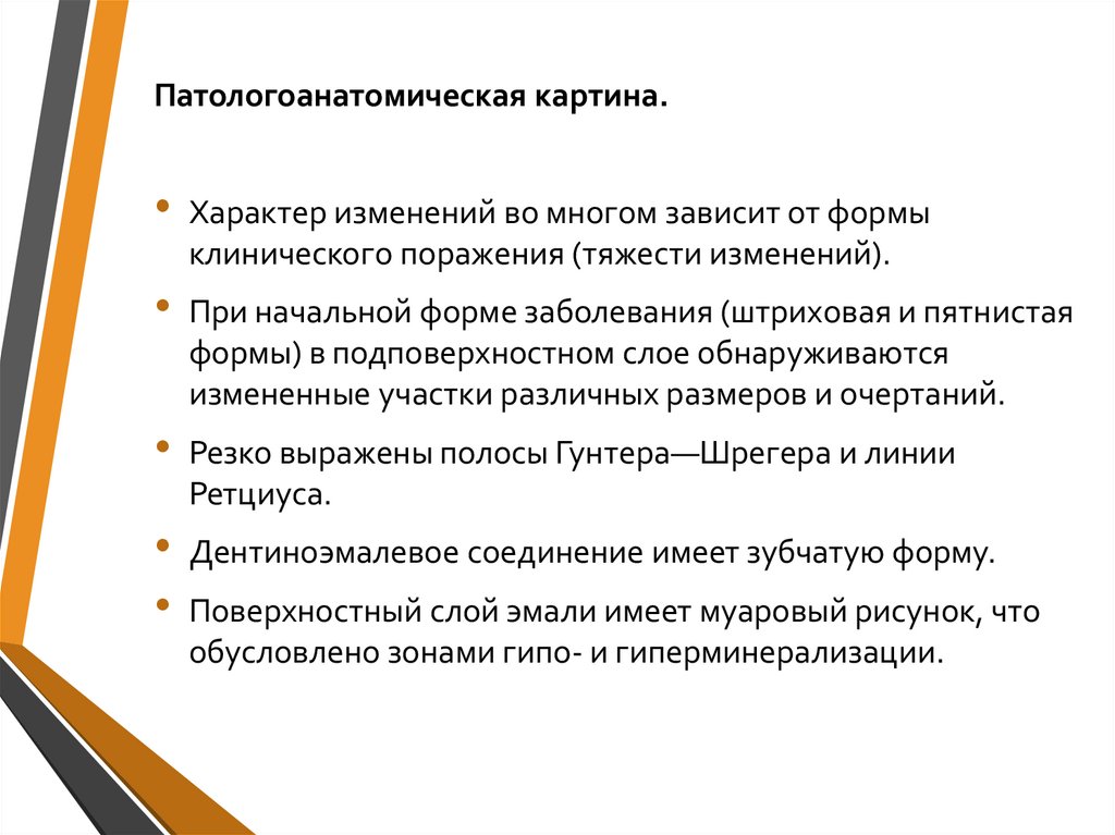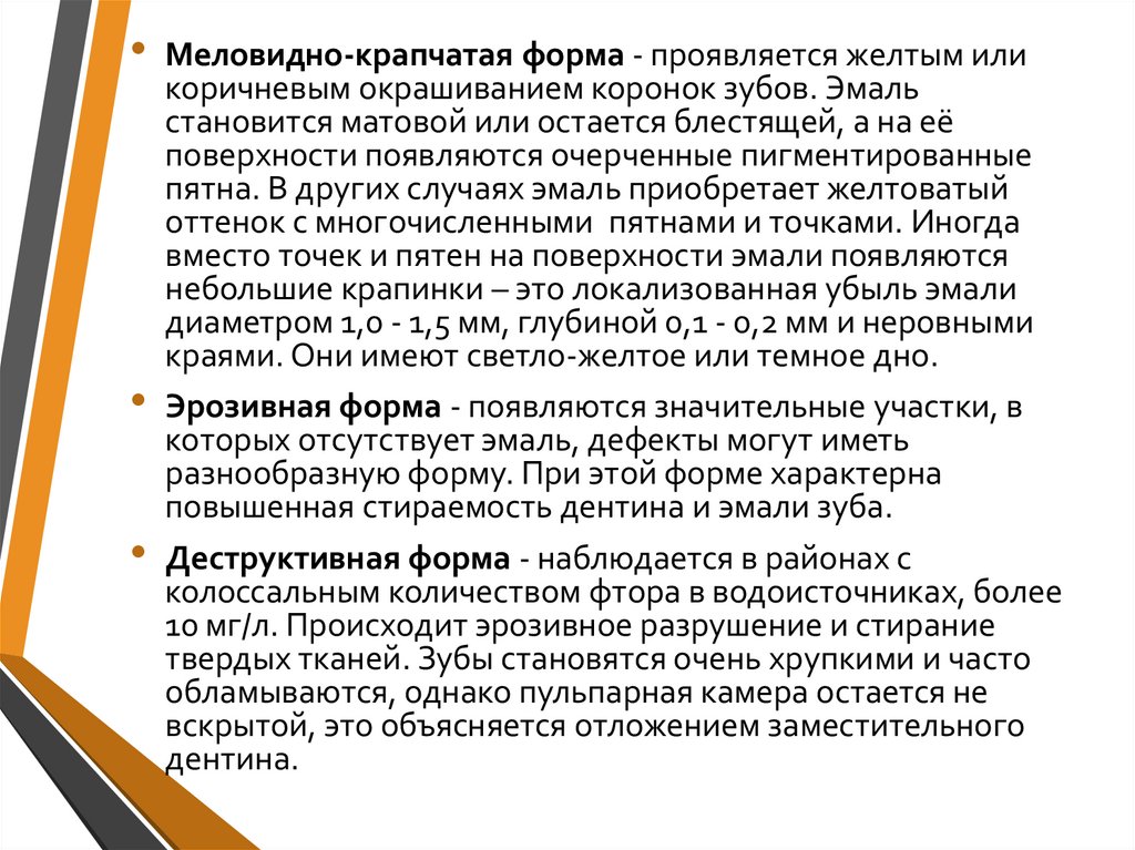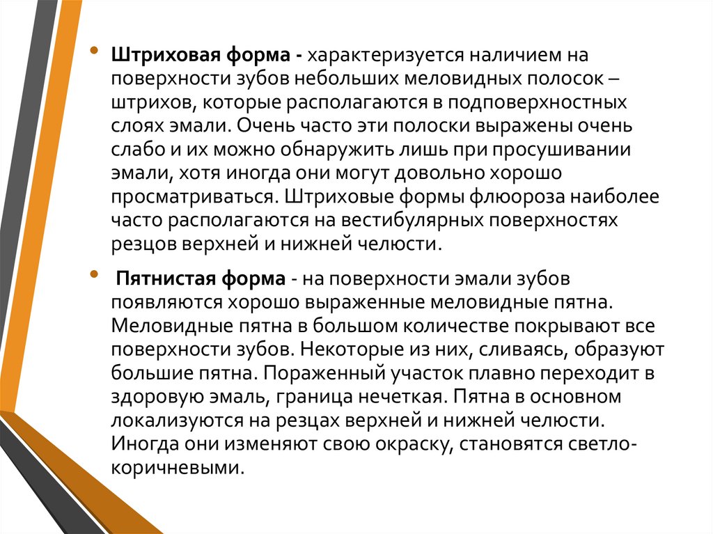 • Штриховая форма - характеризуется наличием наповерхности зубов небольших меловидных полосок –