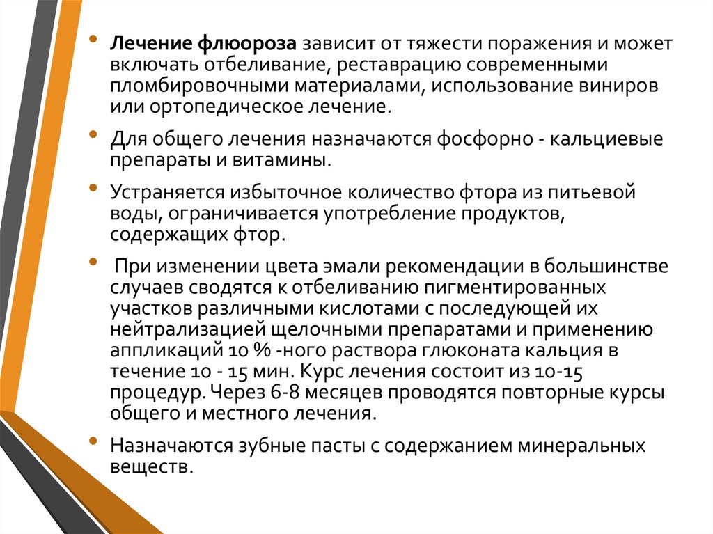 • Лечение флюороза зависит от тяжести поражения и можетвключать отбеливание, реставрацию современными