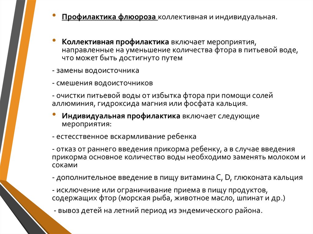 • Профилактика флюороза коллективная и индивидуальная.• Коллективная профилактика включает мероприятия,