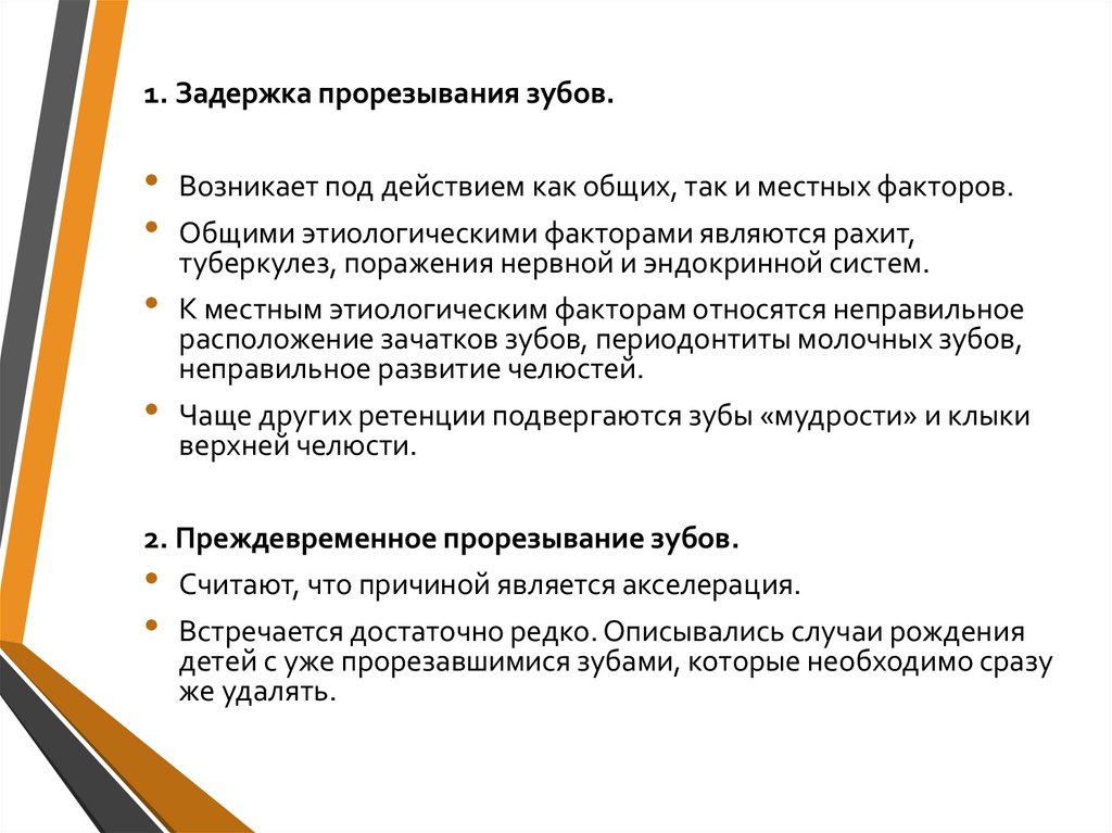 1. Задержка прорезывания зубов.• Возникает под действием как общих, так и местных факторов.