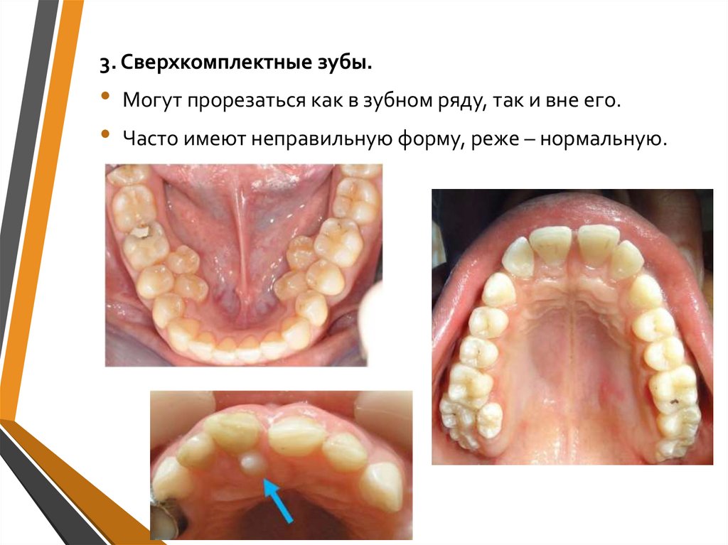 3. Сверхкомплектные зубы.• Могут прорезаться как в зубном ряду, так и вне его.