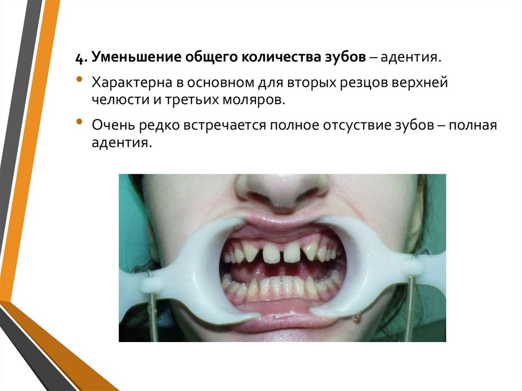 4. Уменьшение общего количества зубов – адентия.• Характерна в основном для вторых резцов верхней