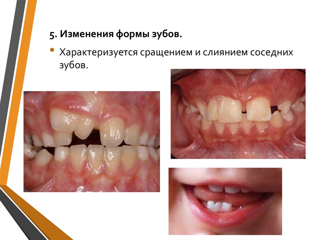 5. Изменения формы зубов.• Характеризуется сращением и слиянием соседних