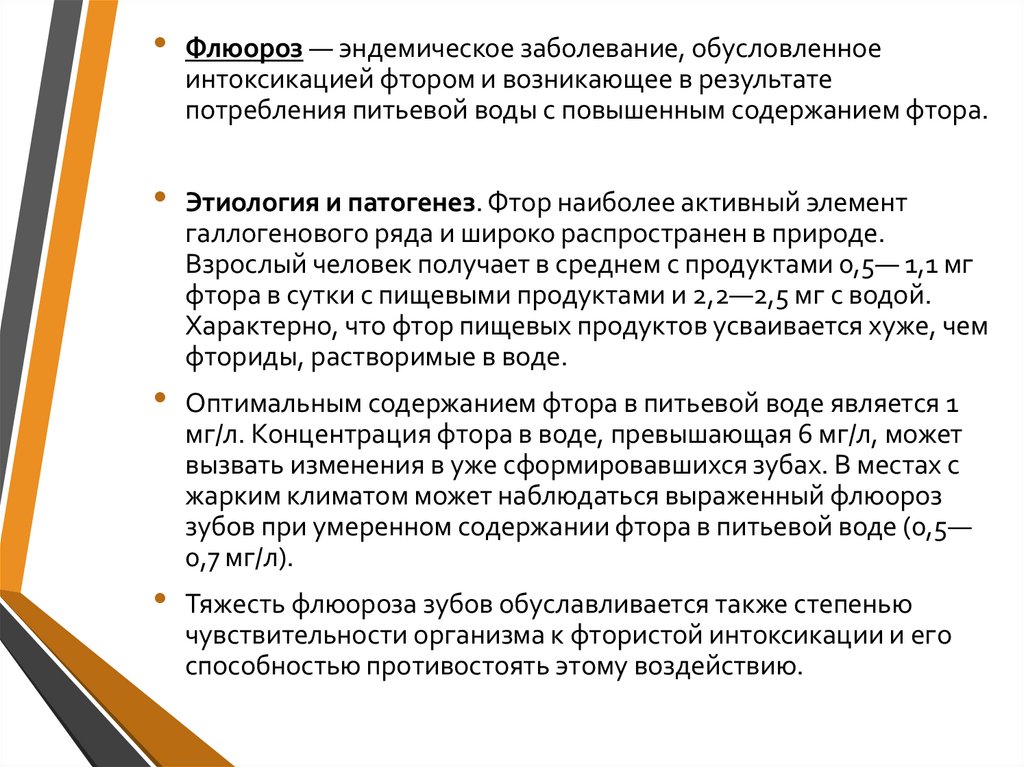 • Флюороз — эндемическое заболевание, обусловленноеинтоксикацией фтором и возникающее в результате