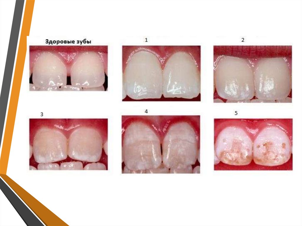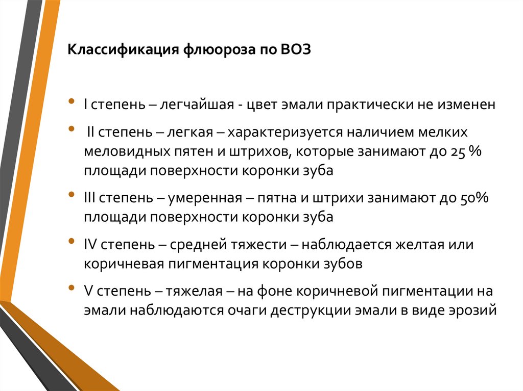 Классификация флюороза по ВОЗ• I степень – легчайшая - цвет эмали практически не изменен