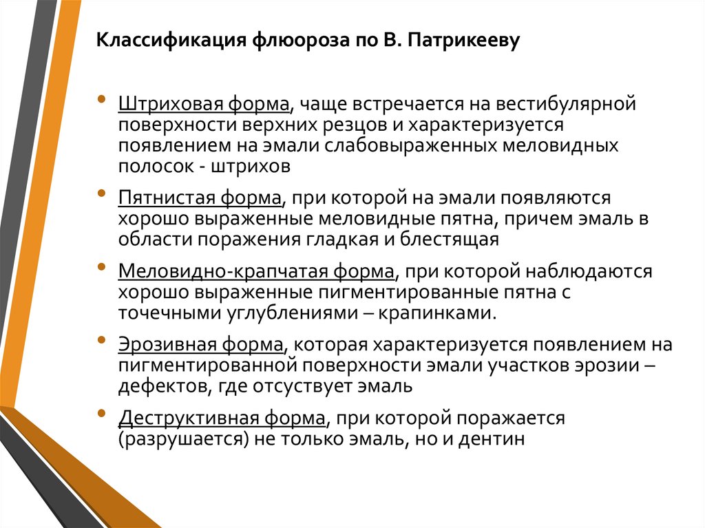 Классификация флюороза по В. Патрикееву• Штриховая форма, чаще встречается на вестибулярной