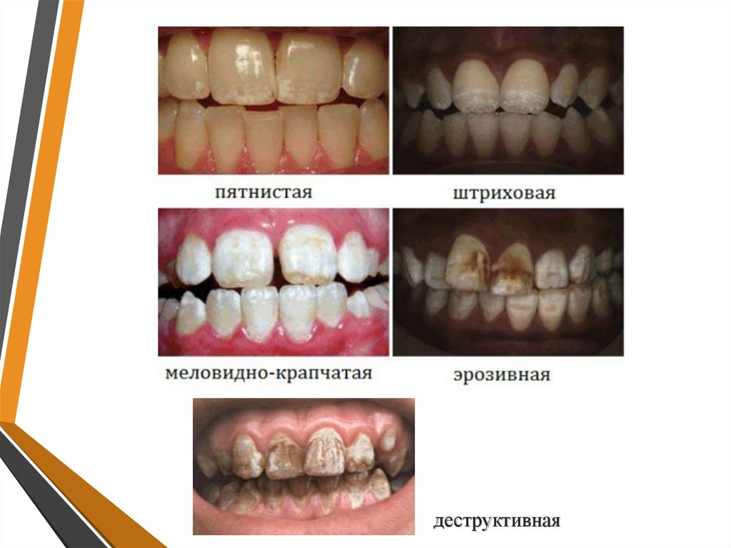 • Меловидно-крапчатая форма - проявляется желтым иликоричневым окрашиванием коронок зубов. Эмаль