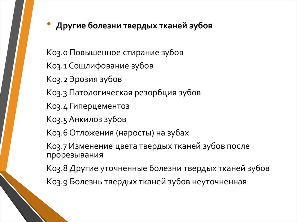 K03.8 Другие уточненные болезни твердых тканей зубов