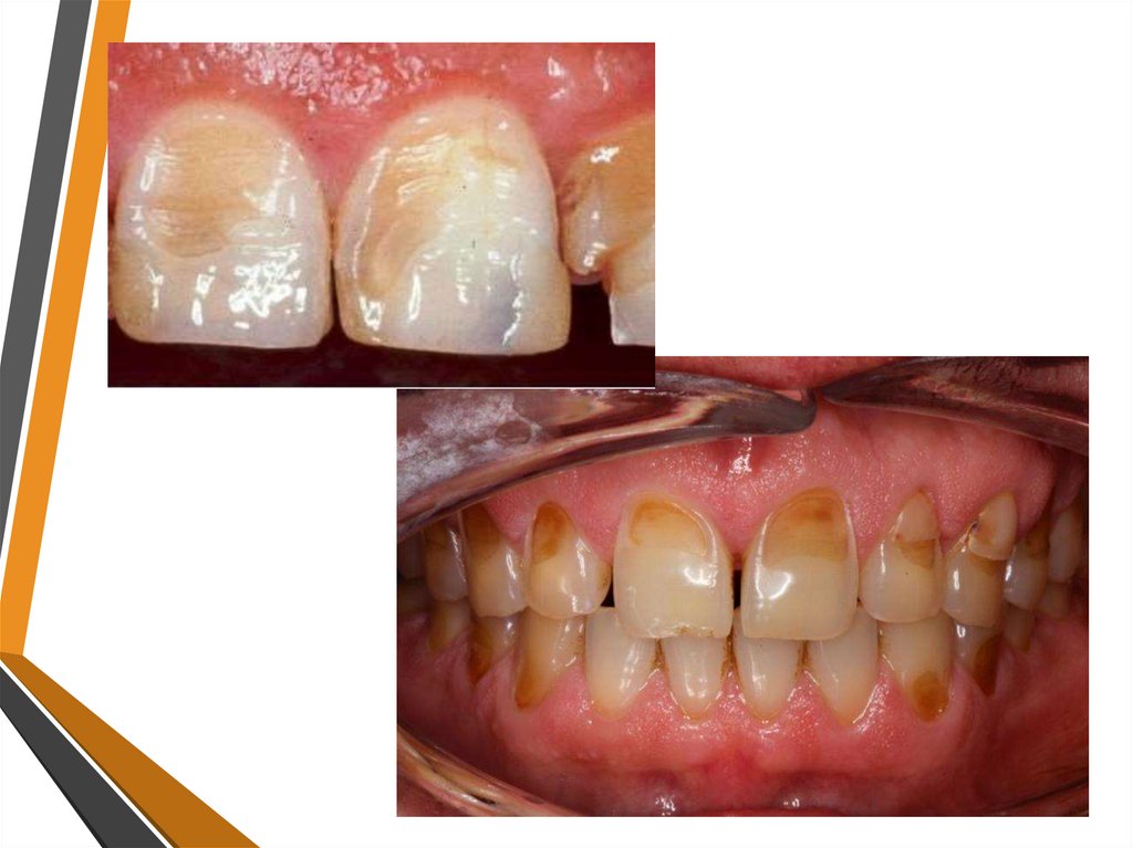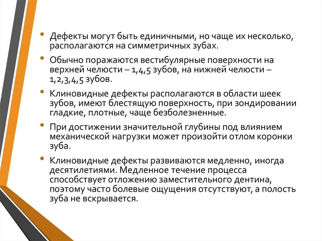 • Дефекты могут быть единичными, но чаще их несколько,располагаются на симметричных зубах.