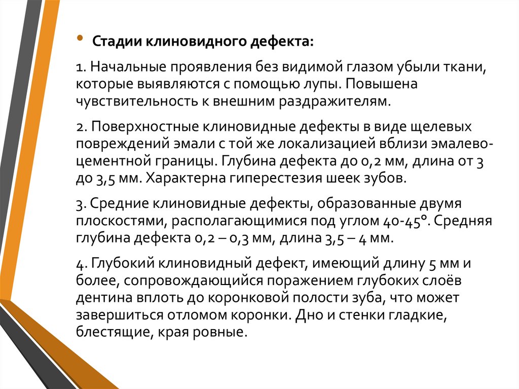• Стадии клиновидного дефекта:1. Начальные проявления без видимой глазом убыли ткани,