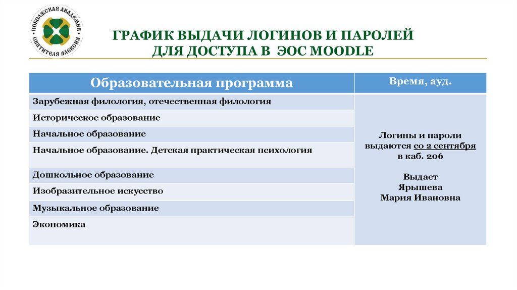 ГРАФИК ВЫДАЧИ ЛОГИНОВ И ПАРОЛЕЙДЛЯ ДОСТУПА В ЭОС MOODLE