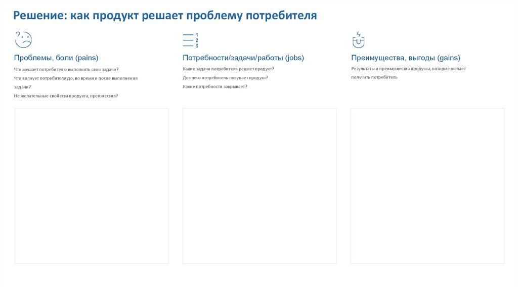Решение: как продукт решает проблему потребителяПроблемы, боли (pains)