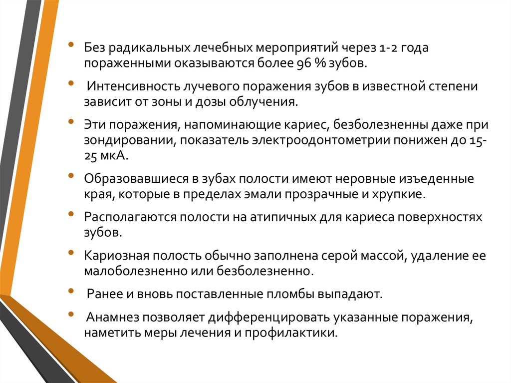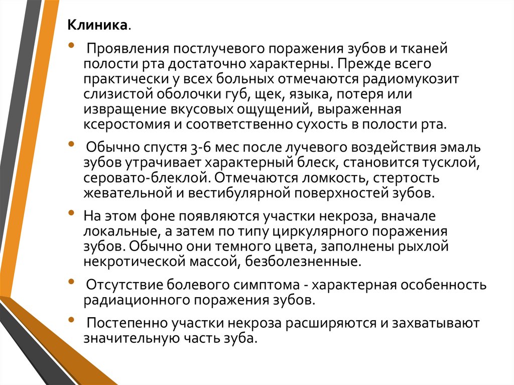 Клиника.• Проявления постлучевого поражения зубов и тканей
