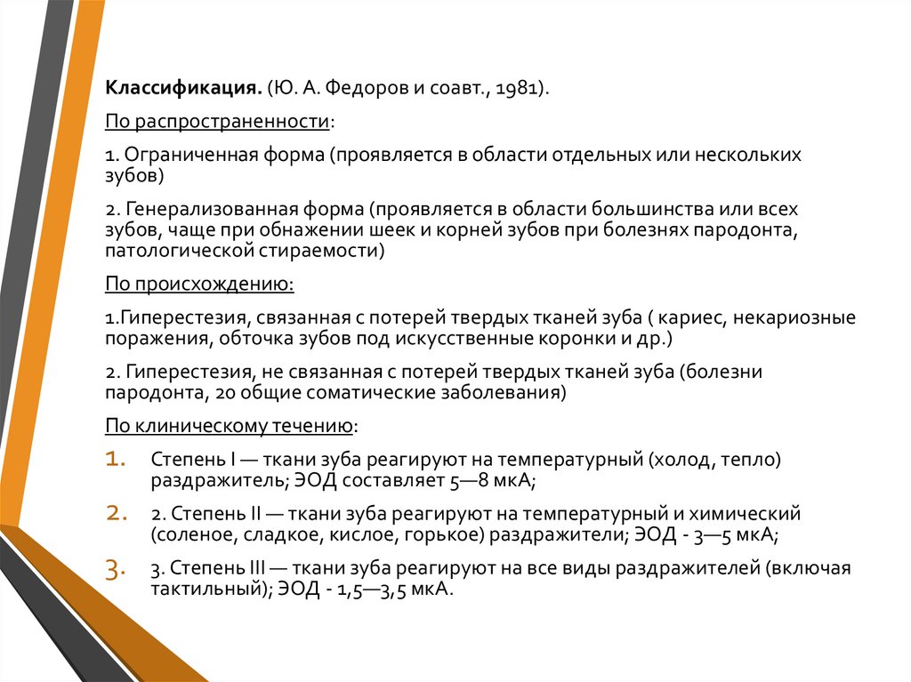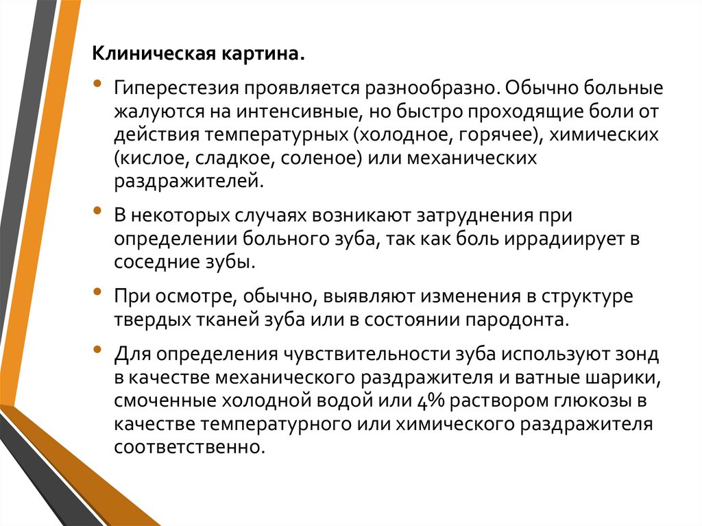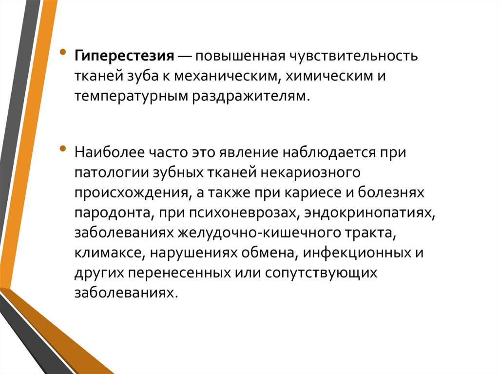 • Гиперестезия — повышенная чувствительностьтканей зуба к механическим, химическим и