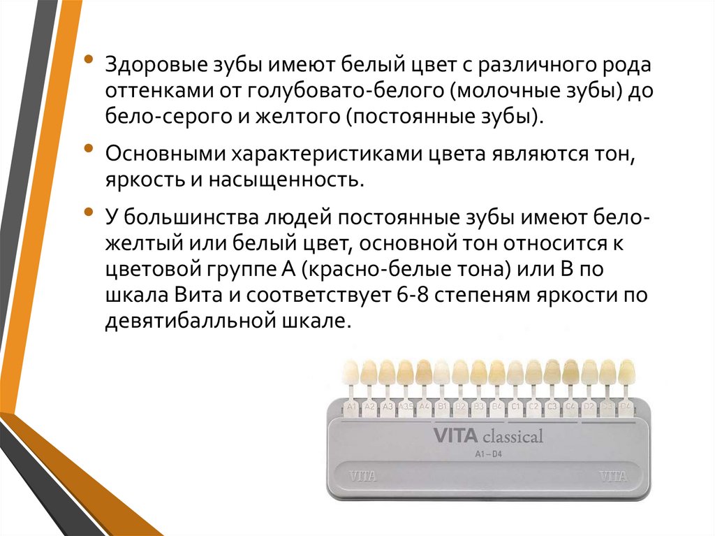 • Здоровые зубы имеют белый цвет с различного родаоттенками от голубовато-белого (молочные зубы) до