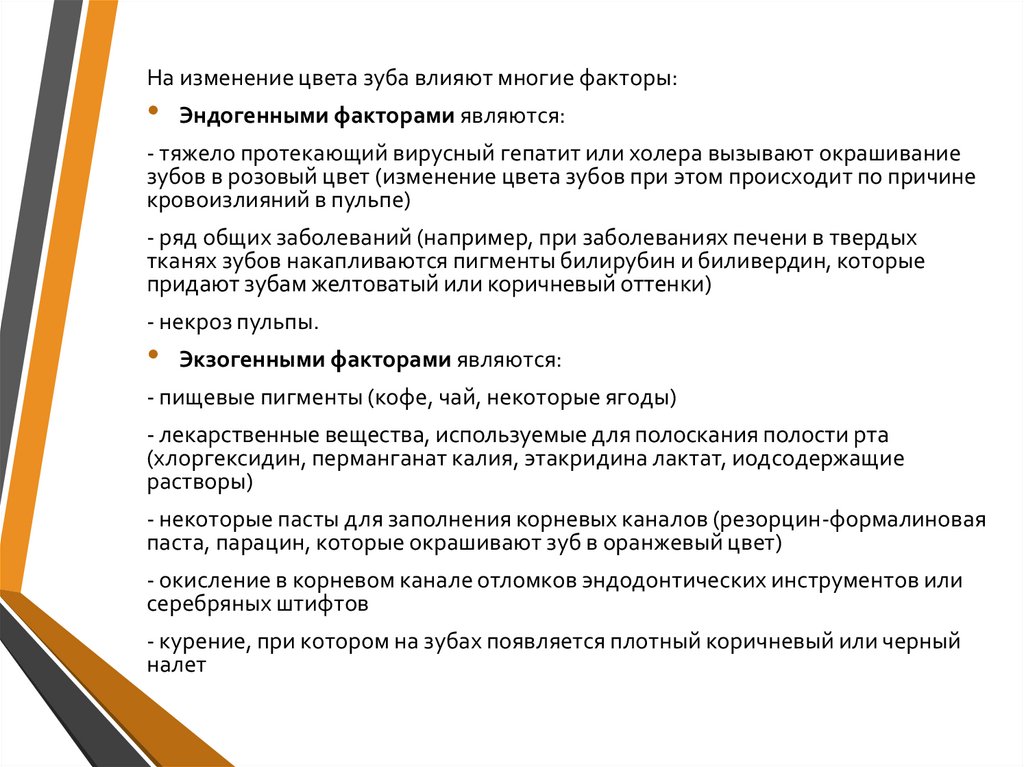 На изменение цвета зуба влияют многие факторы:• Эндогенными факторами являются: