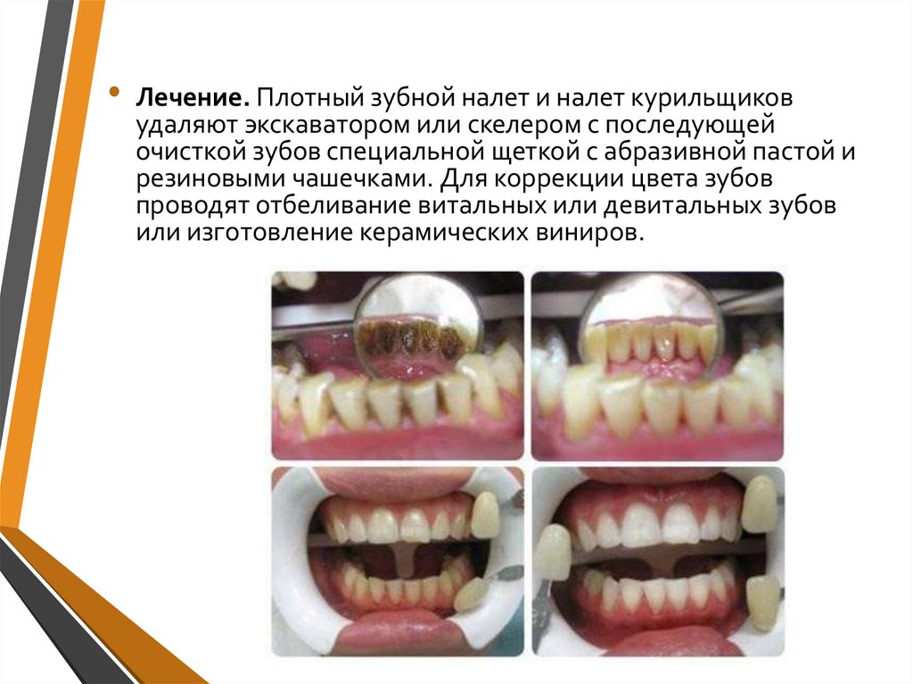 • Лечение. Плотный зубной налет и налет курильщиковудаляют экскаватором или скелером с последующей