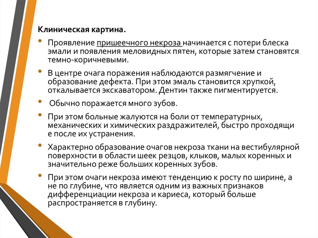 Клиническая картина.• Одними из первых клинических признаков кислотного некроза