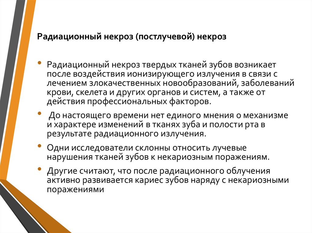 Радиационный некроз (постлучевой) некроз• Радиационный некроз твердых тканей зубов возникает