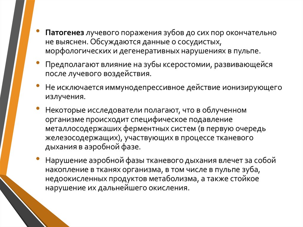 • Патогенез лучевого поражения зубов до сих пор окончательноне выяснен. Обсуждаются данные о сосудистых,