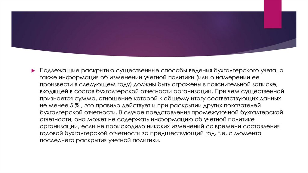 Подлежащие раскрытию существенные способы ведения бухгалтерского учета, атакже информация об изменении учетной политики (или о намерении ее