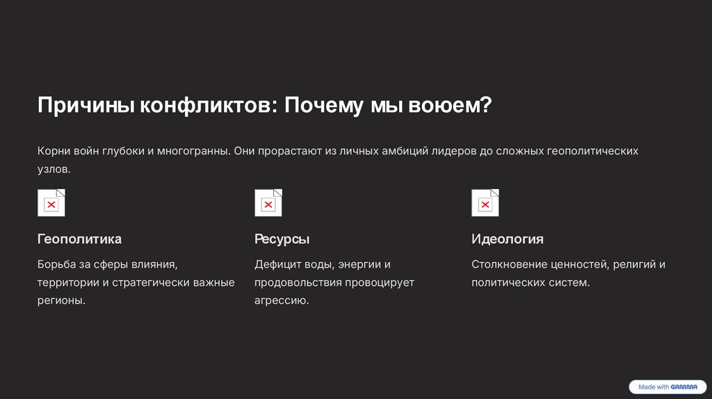 Причины конфликтов: Почему мы воюем?Корни войн глубоки и многогранны. Они прорастают из личных амбиций лидеров до сложных геополитических