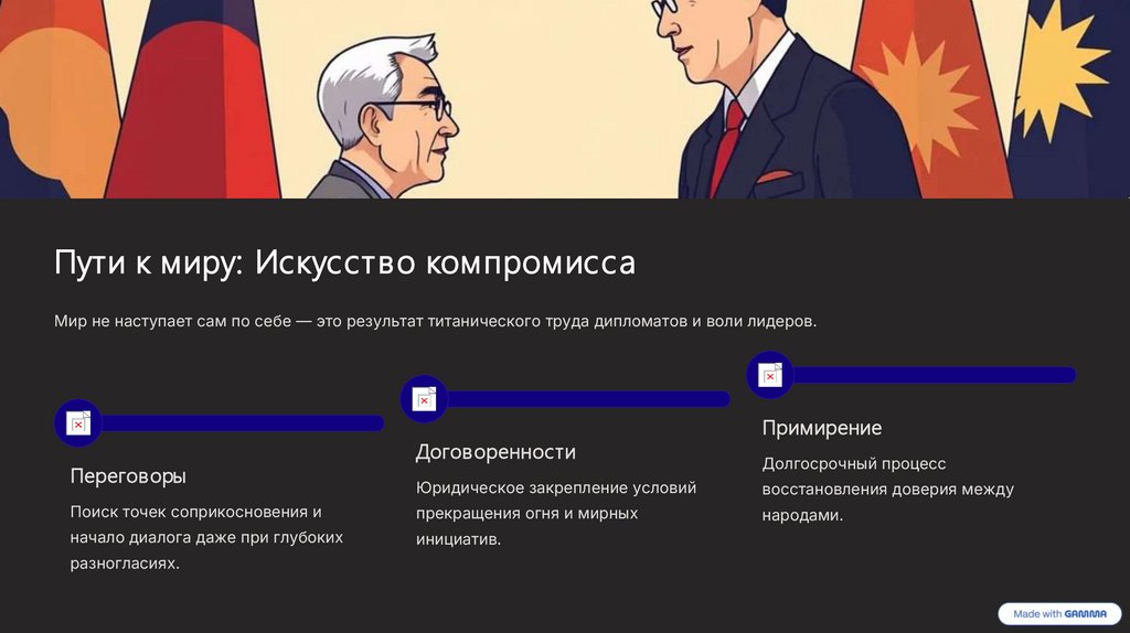 Пути к миру: Искусство компромисс аМир не наступает сам по себе — это результат титанического труда дипломатов и воли лидеров.