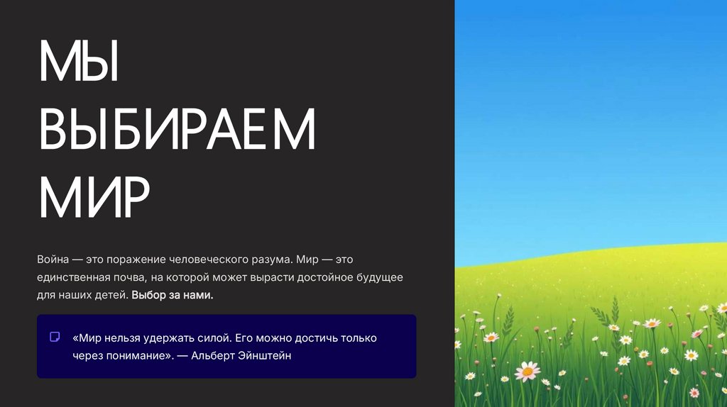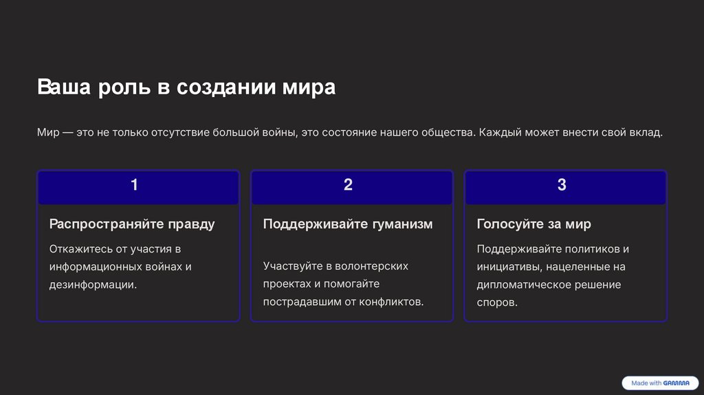 Ваша роль в создании мираМир — это не только отсутствие большой войны, это состояние нашего общества. Каждый может внести свой вклад.
