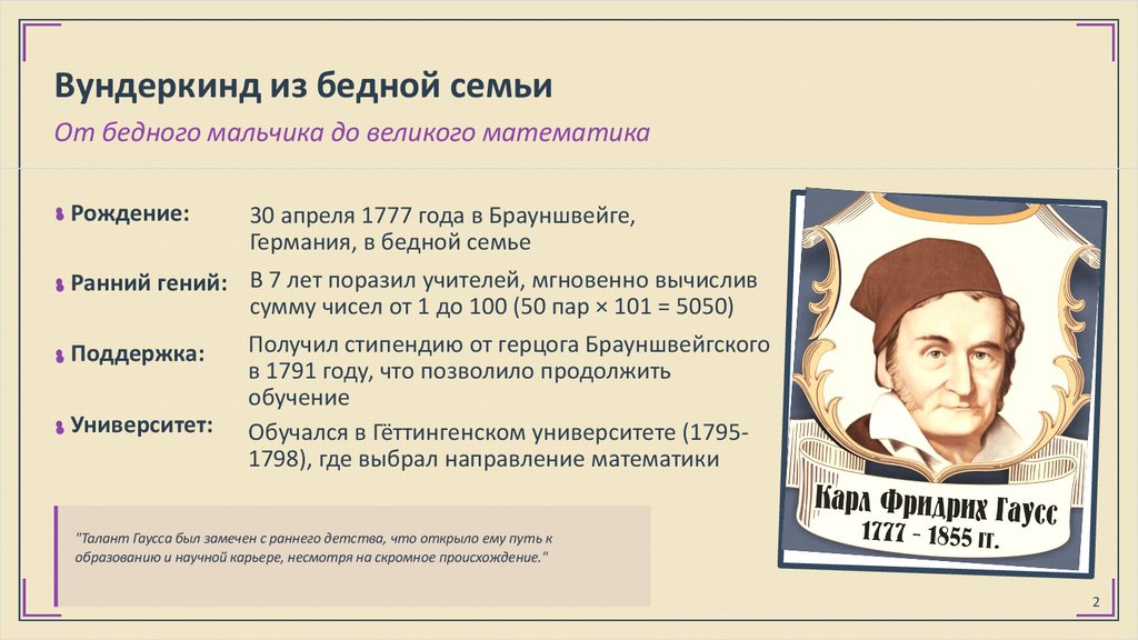 "Талант Гаусса был замечен с раннего детства, что открыло ему путь к