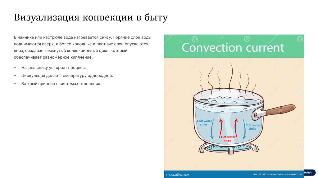 Визуализация конвекции в бытуВ чайнике или кастрюле вода нагревается снизу. Горячие слои воды