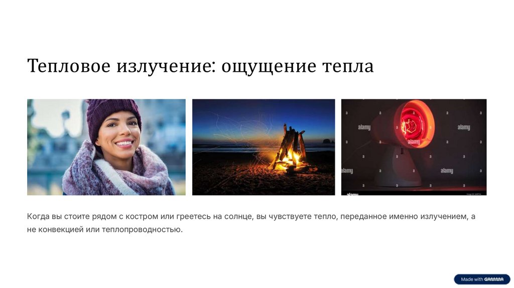 Тепловое излучение: ощущение теплаКогда вы стоите рядом с костром или греетесь на солнце, вы чувствуете тепло, переданное именно излучением, а