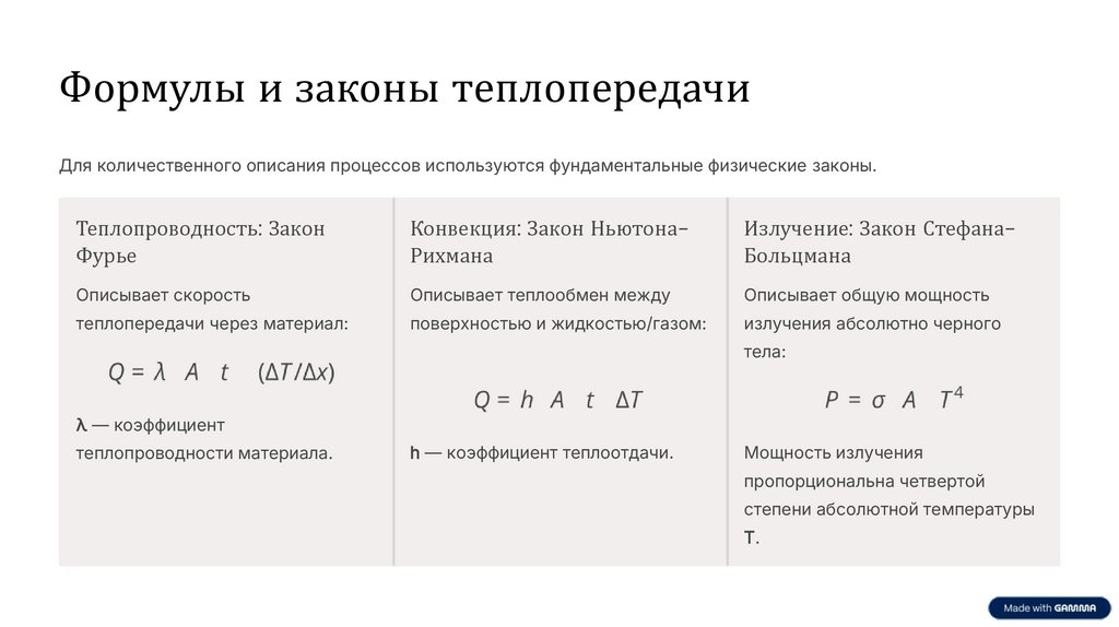 Формулы и законы теплопередачиДля количественного описания процессов используются фундаментальные физические законы.
