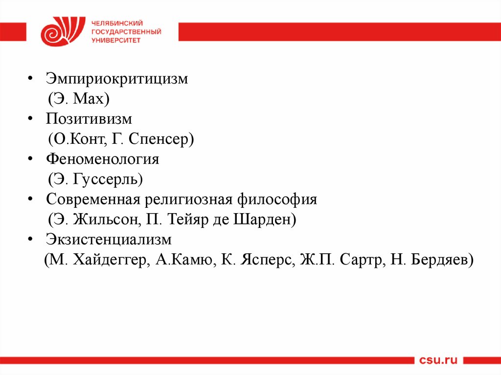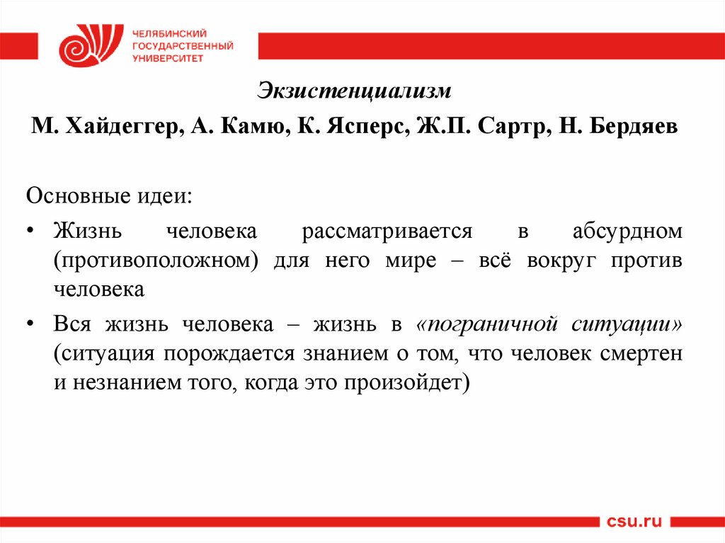 (М. Хайдеггер, А.Камю, К. Ясперс, Ж.П. Сартр, Н. Бердяев)