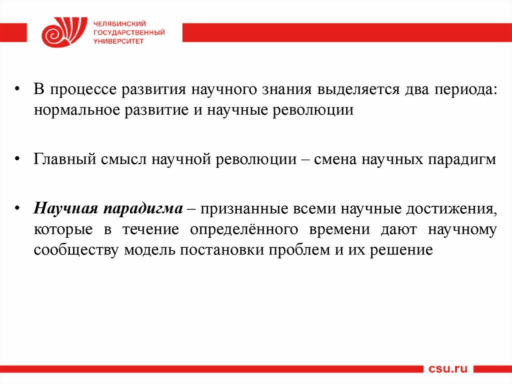 • В процессе развития научного знания выделяется два периода:нормальное развитие и научные революции