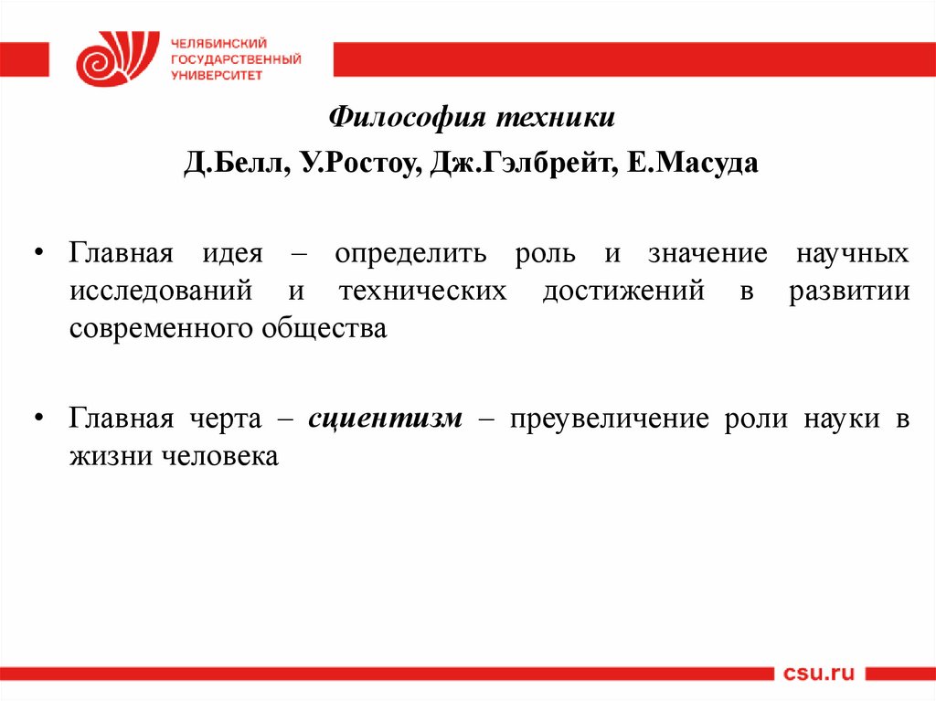 Философия техникиД.Белл, У.Ростоу, Дж.Гэлбрейт, Е.Масуда