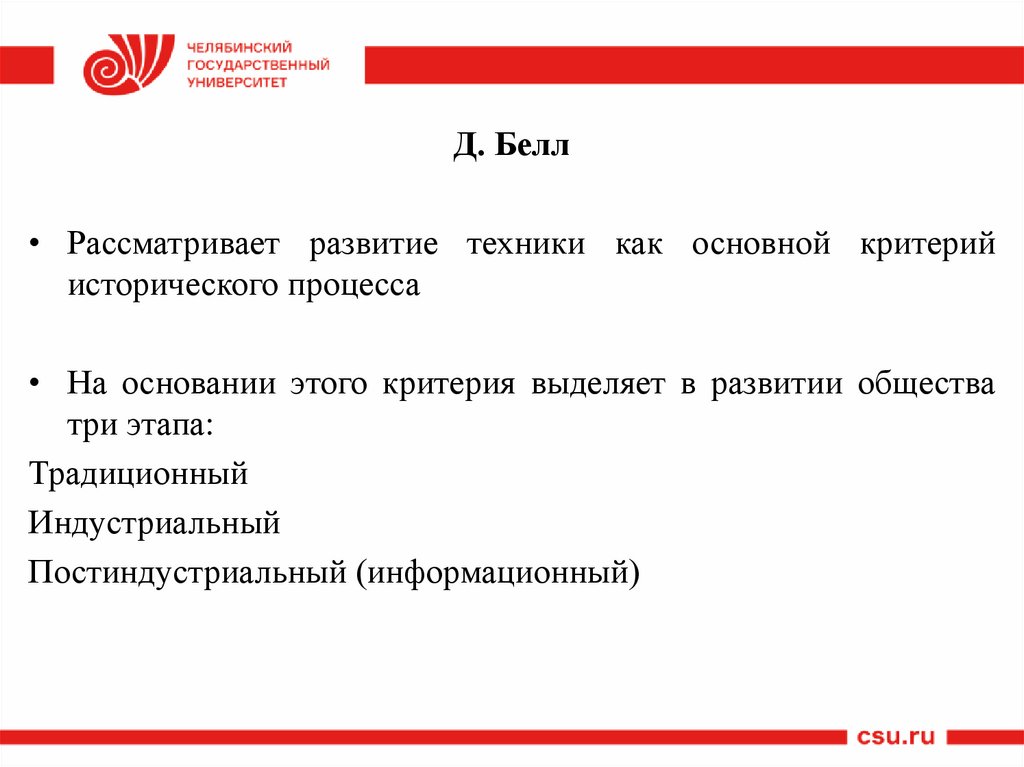 Д. Белл• Рассматривает развитие техники как основной критерий