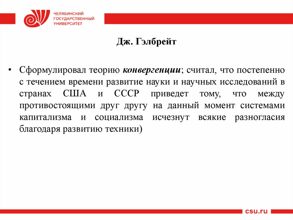 Дж. Гэлбрейт• Сформулировал теорию конвергенции; считал, что постепенно