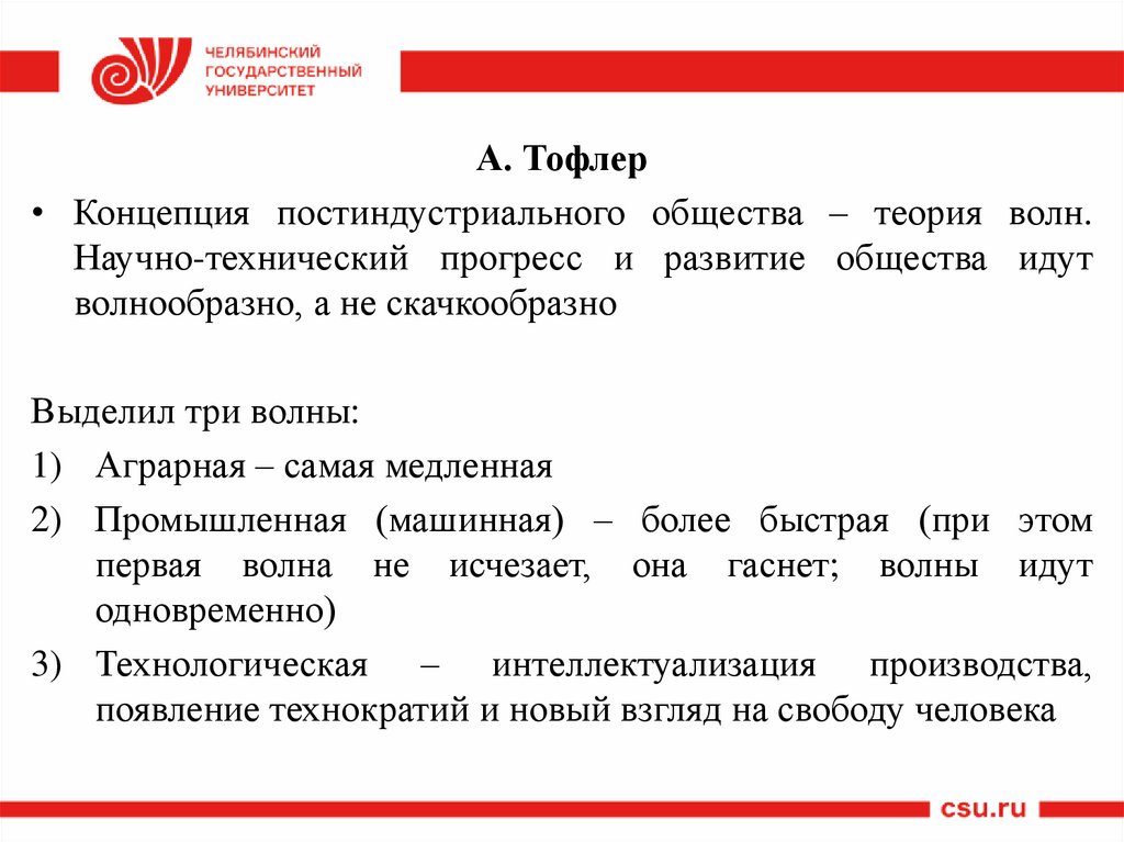А. Тофлер• Концепция постиндустриального общества – теория волн.